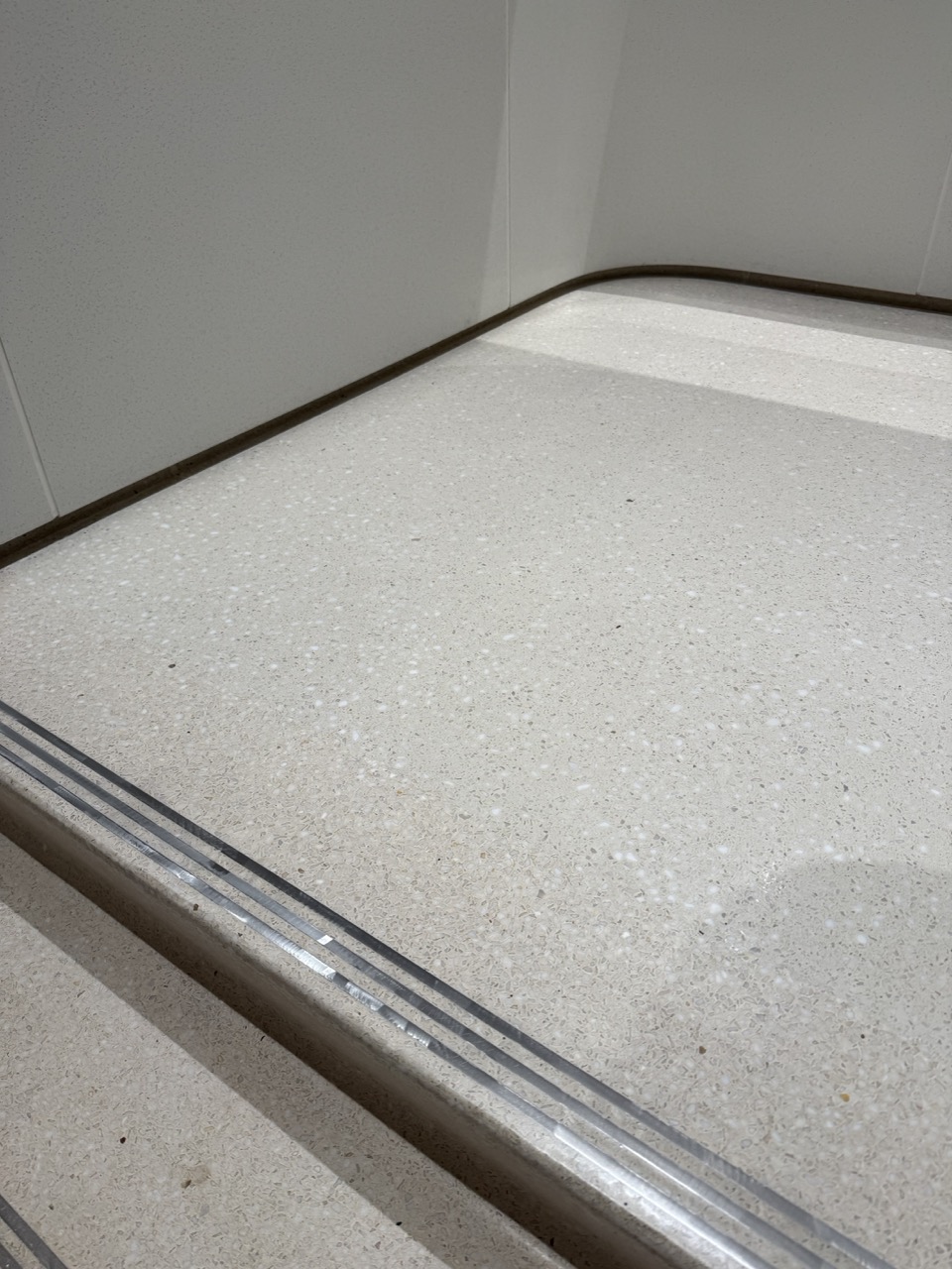 The system is installed as a seamless terrazzo incorporating decorative aggregates, which can be fully customised in terms of colour, blend, and finish. Once cured, the surface is ground and polished to produce a smooth, highly decorative floor with excellent abrasion resistance and long-term performance. The seamless nature of the system makes it hygienic and easy to maintain, with no joints or grout lines to harbour dirt or bacteria.