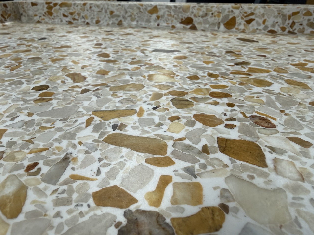 The system is installed as a seamless terrazzo incorporating decorative aggregates, which can be fully customised in terms of colour, blend, and finish. Once cured, the surface is ground and polished to produce a smooth, highly decorative floor with excellent abrasion resistance and long-term performance. The seamless nature of the system makes it hygienic and easy to maintain, with no joints or grout lines to harbour dirt or bacteria.